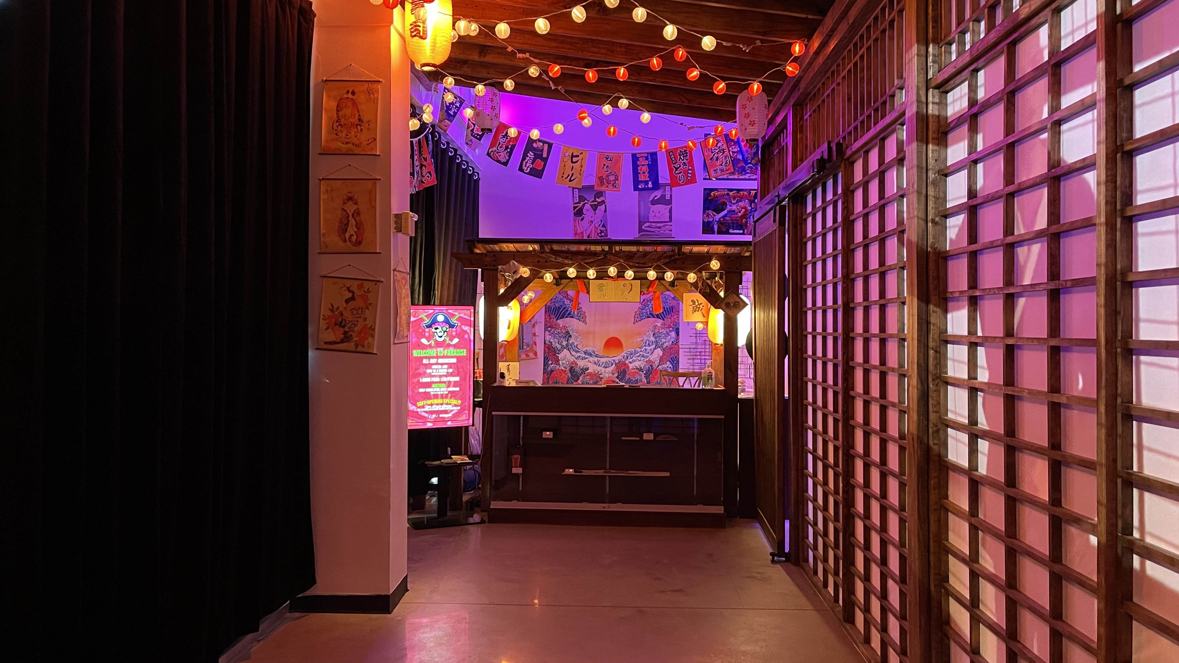 Have you ever wondered what it’s like to step into a Japanese dojo? Here, you can. The moment you walk through the shoji doors, you’re greeted by an atmosphere that feels both ancient and futuristic. Paper lanterns guide your way as you explore, while the aroma of authentic Asian street food fills the air. This isn’t just decoration; it’s a journey through Japanese culture. Every corner of the arcade reflects this theme, from the yatai-style ticket booth to the vibrant street art on the walls. It’s not just a place to play—it’s a destination that transports you to another world.